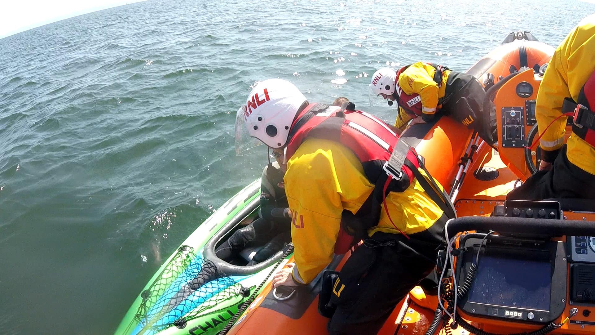 HM Coastguard tasked Porthcawl RNLI’s volunteer crew to assist two people on an inflatable kayak struggling to get back to shore. The casualties were being aided by an RNLI lifeguard who had paddled out to them on a rescue paddle board.